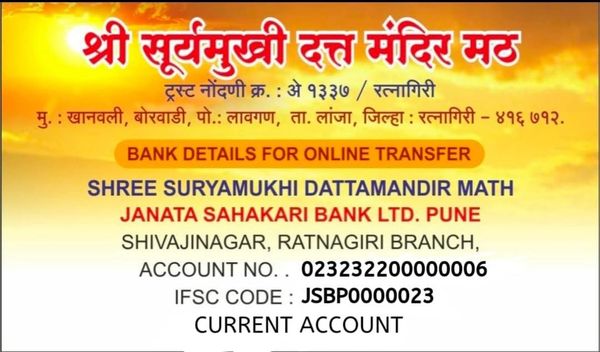 There are various alternatives to make a donation to Shree Suryamukhi Datta Mandir Math Trust like NEFT, RTGS to following Account Details.